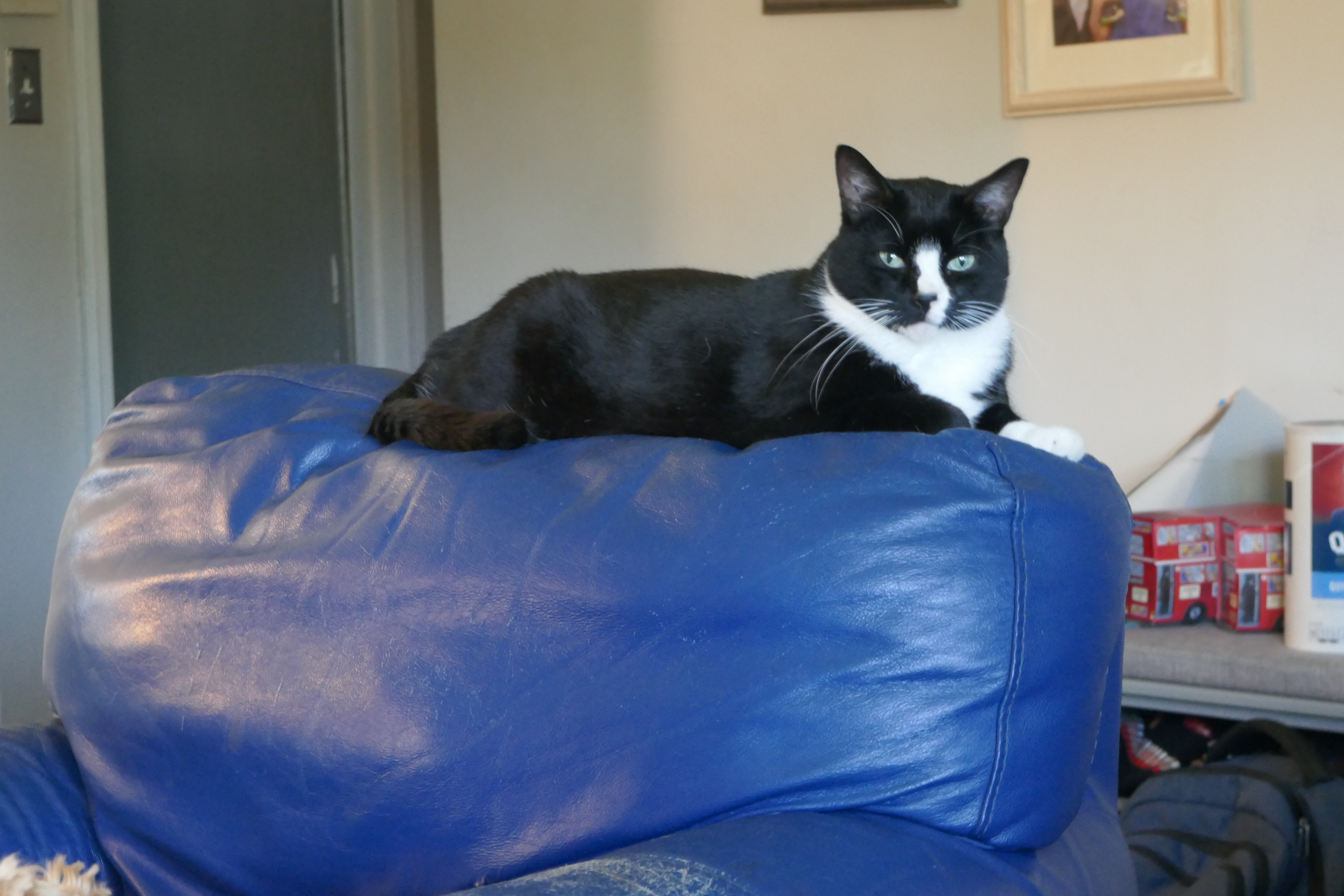 From then on, he went about the work of establishing his rule. King Socks can let himself in and out of the house, without waiting for permission. He sits wherever he wishes, including on your lap uninvited, sitting on whatever book or paper you might have been using. Socks can also claim the back of the chair, so that he can majestically stare down on the peasants who are merely sitting on the seat.